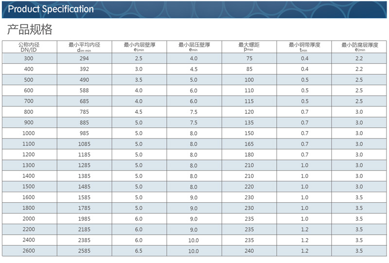 該產品將鋼材的高剛度、高強度和塑料的耐腐蝕、耐磨損和柔韌性等優良性結合起來,不僅可使管材達到SN8、SN10、SN12.5、SN16三個級別環剛度,而且還解決了鋼材的耐腐蝕問題,彌補了較大直徑全塑料埋地排水管環剛度一般只能達到SN8的弱點。